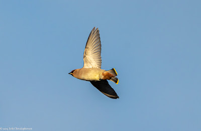 Ikke uventet dukked de første Krognæb op i dag, og jeg fandt de første ved Batteriskoven. To eks. kom flyvende fra Sønderstrand og landede i de højeste grantræer i Batteriskoven. Jeg skyndte mig at at få gravet kameraet frem, men forgæves. Jeg nåede kun at få et billede af trætoppen uden fugle da de fløj i samme øjeblik. Hjemme på PC'eren fandt jeg dog i det nederste hjørne af billedet den ene af krognæbbene flyve væk. Så her er et doku-skud af Skagens første 2019-Krognæb.